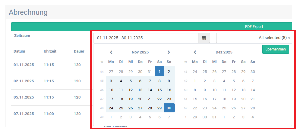 Tragen Sie den Zeitraum ein, für den die Abrechnung erstellt werden soll.