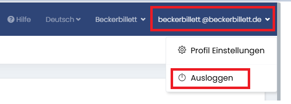 Zum Abmelden aus dem System wird die E-Mail-Adresse oben rechts im Bildschirm ausgewählt.