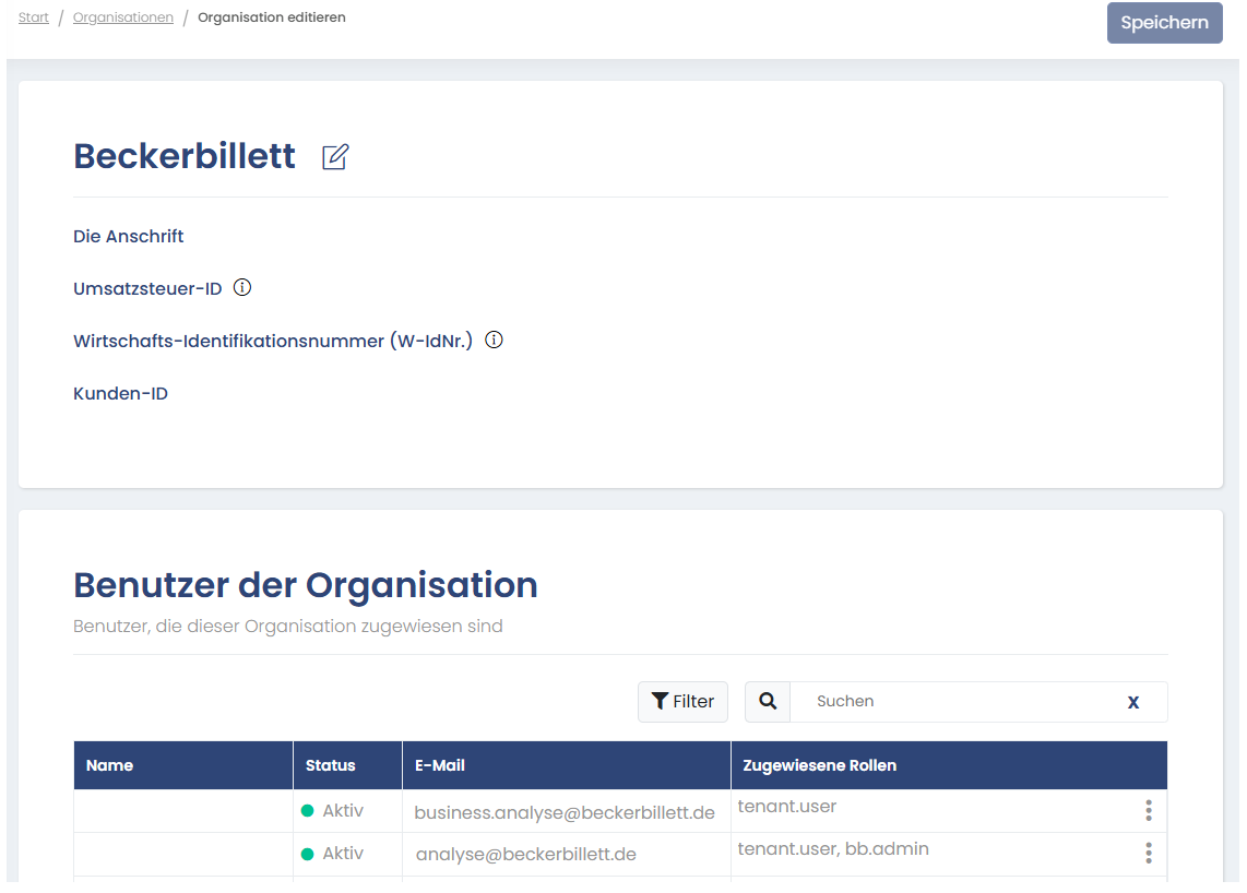 - Klicken Sie auf den Organisationsnamen (im Beispiel: Beckerbillett).