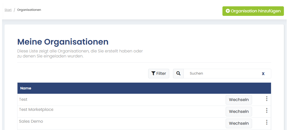 Anschließend wird eine Übersicht aller Organisationen angezeigt, auf welche der Benutzer Zugriff hat.