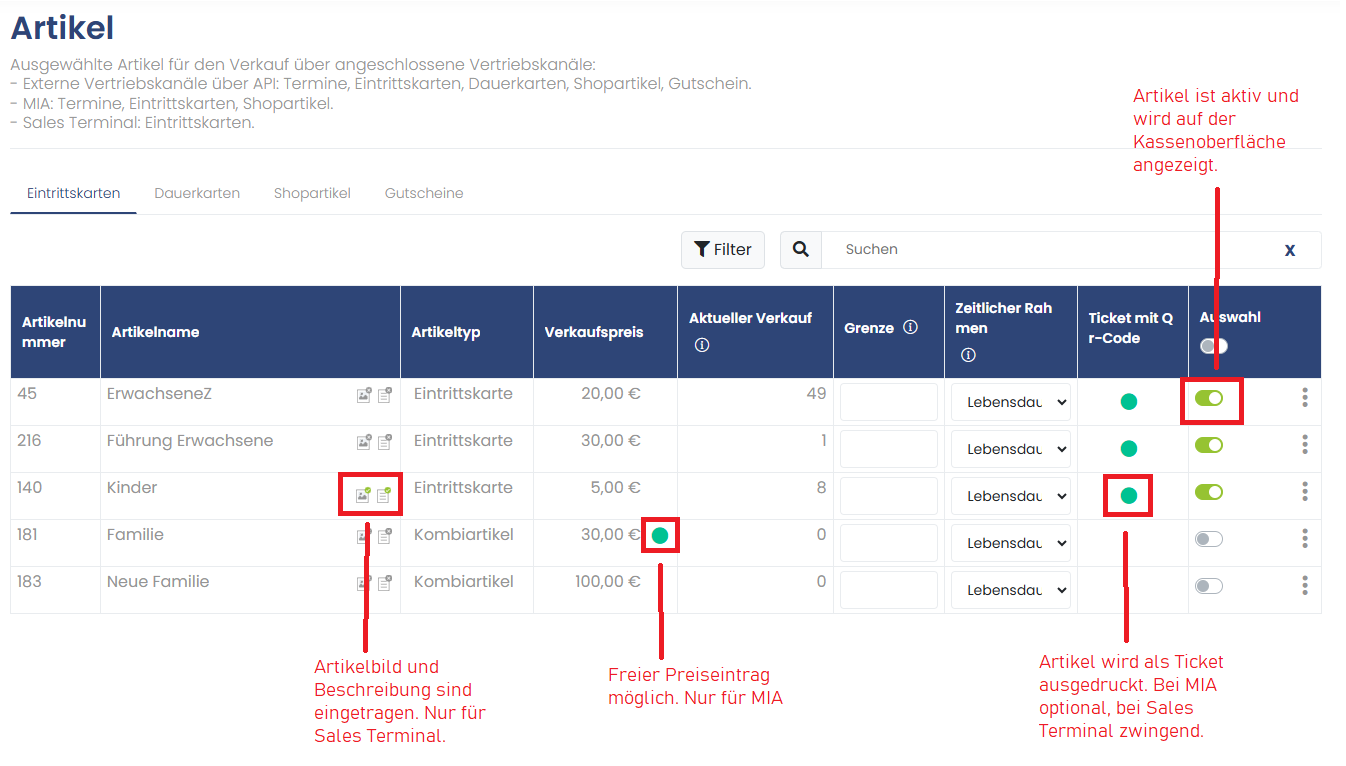 Um einen Artikel zu aktivieren, den entsprechenden Button auf grün schalten.