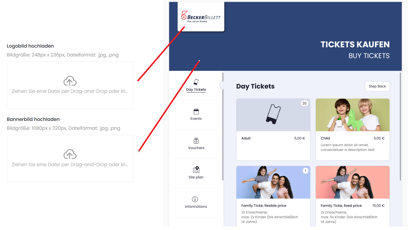 Wird kein Logo oder kein Bannerbild eingefügt, werden automatisch die Standardeinstellungen von Beckerbillett verwendet.